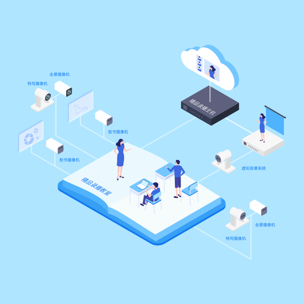 精品錄播教室采用七個機位打造,并且向下兼容多種機位方案。不僅自動跟蹤記錄上課過程的多個場景,還支持遠程互動教學。并集合虛擬摳像功能,師生可自由選擇2D、3D場景,一室多用,滿足精品課程錄制、遠程互動教學、虛擬微課制作等多種需求。