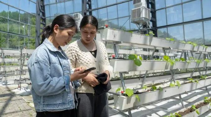 2024年4月24日,徐林艷(左)和郜艷芳(右)通過手機(jī)查看大棚實時數(shù)據(jù)。(黃定懿 攝) 如果說水、肥是傳統(tǒng)農(nóng)業(yè)的關(guān)鍵,那么電毫無疑問是智慧農(nóng)業(yè)的關(guān)鍵。據(jù)悉,為了確保智能蔬菜園高品質(zhì)用電,當(dāng)?shù)毓╇姴块T對一條10千伏配電線路進(jìn)行了升級改造,同時新增了1臺400千伏安變壓器。