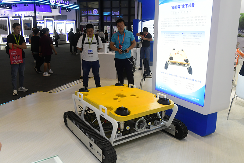 ??長期行駛在海上的遠洋船舶,其水下部分的船體表面會附有貝類、藻類生物,并且生出銹斑,除了影響船舶的航行速度和使用壽命以外,還會增加油耗。每年因海洋附著生物造成的經濟損失就超過百億美元。上海理工大學的“‘海鮣號’遠洋船舶清洗機器人系統”破解了這一難題。展臺前,該項目吸引了大量觀眾駐足。作為國內外首次采用“浮游+爬行”模塊化重構技術的船體附著物清洗機器人,它既能以浮游模式完成清洗任務,也可通過自主設計的柔性履帶底盤,以爬行模式進行清洗作業,可滿足不同結構類型船舶的清洗需求。